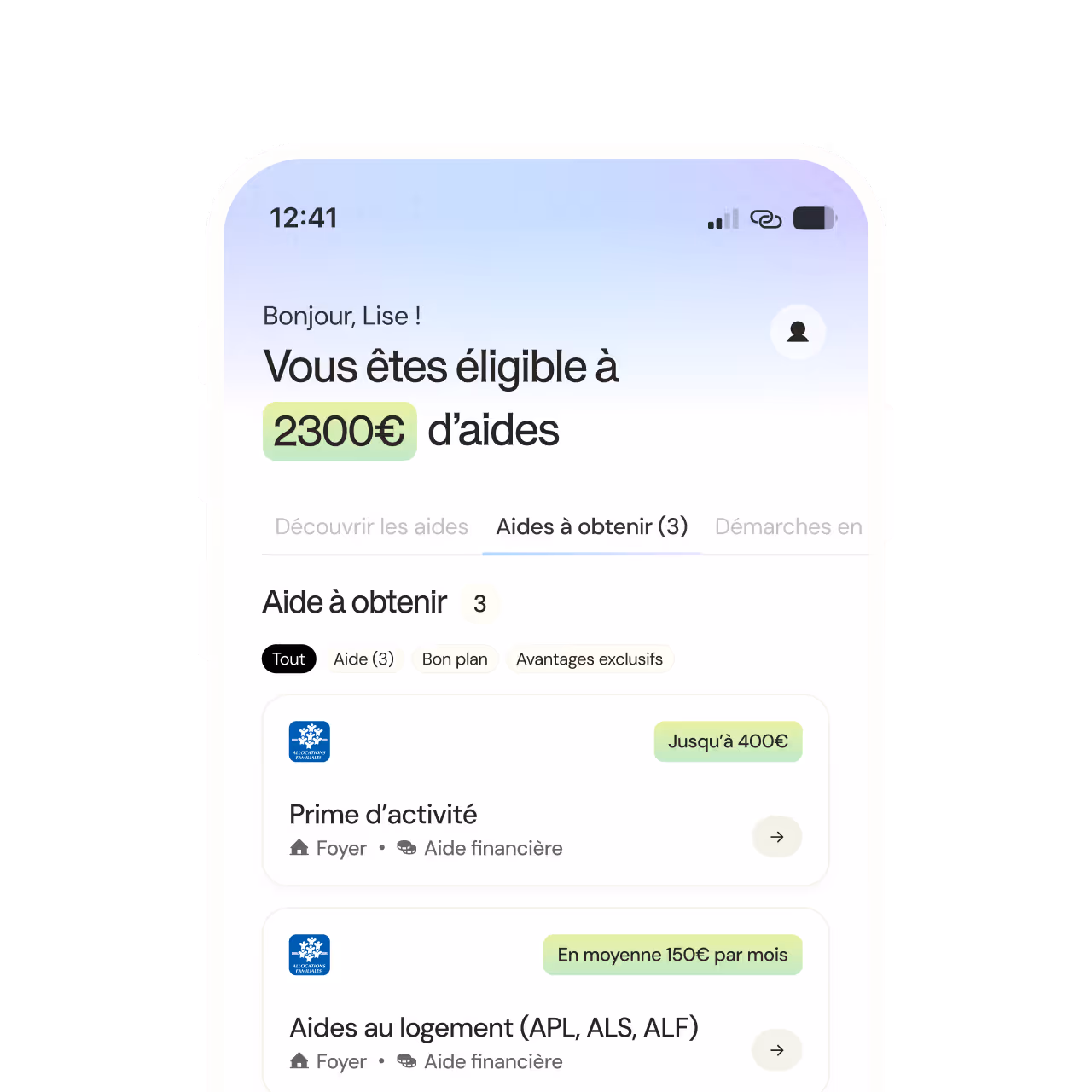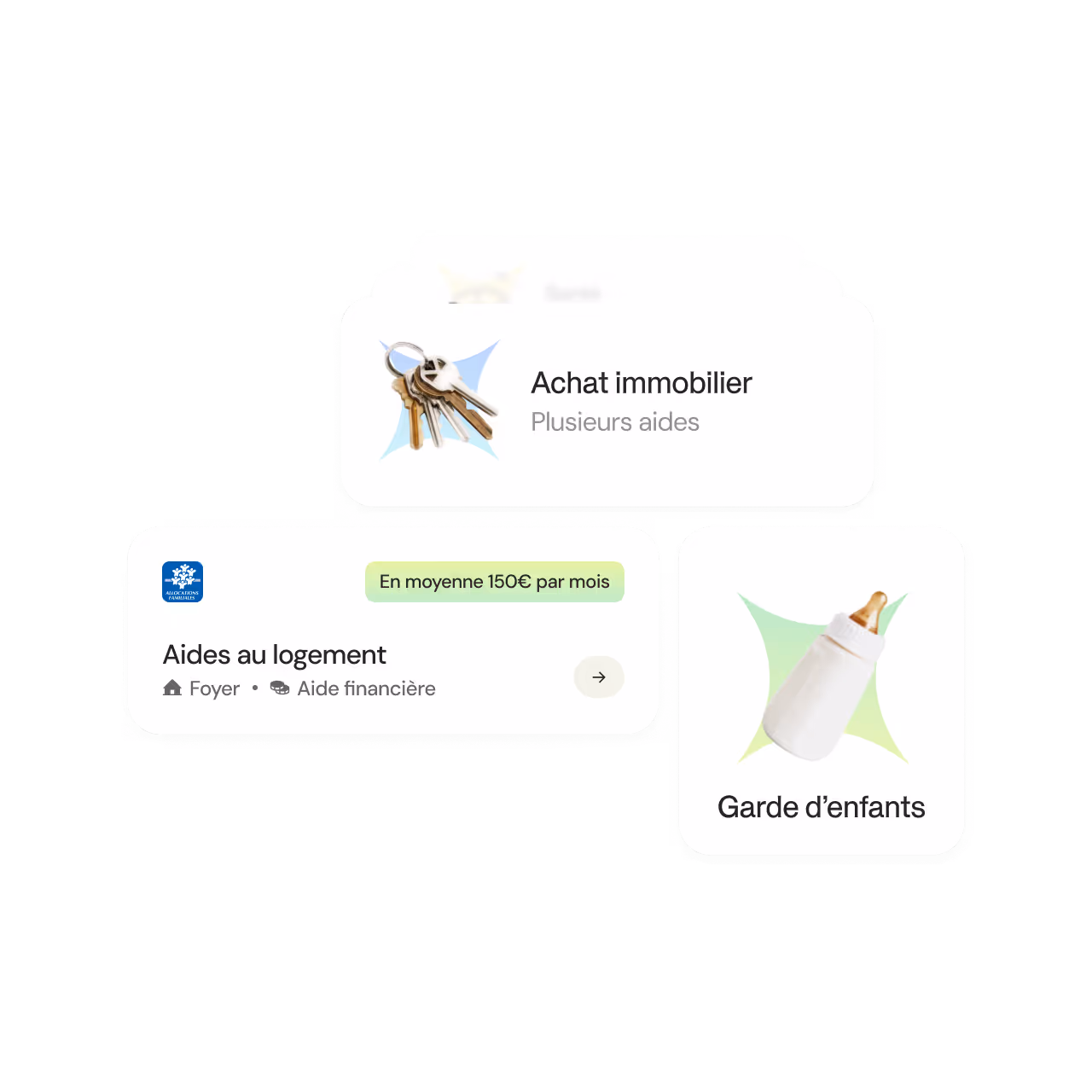 Logement (APL, aides à la rénovation énergétique), mobilité (prime à la conversion, forfait mobilité durable), parentalité (prime de naissance, aides à la garde d’enfant), handicap (AAH, AEEH), proches aidants… Klaro prend en compte l’ensemble des situations, pour tous les membres du foyer.