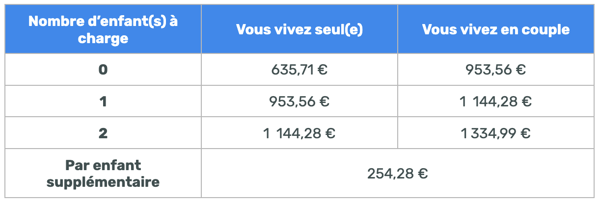 Il varie selon le nombre de personnes que vous avez à charge et selon votre situation (si vous vivez seul(e) ou à deux). Le 1er avril 2024, le RSA a été revalorisé d'environ 4,6% (comme d'autres minimas sociaux), passant à 635,71 euros par mois pour une personne seule et sans enfant à charge.